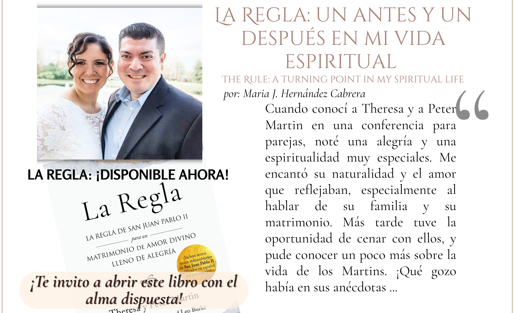 La Regla literalmente marcó un antes y un después en mi vida espiritual, en mi deseo por alcanzar la santidad, en mi amistad con San Juan Pablo II, y en mis expectativas como esposa de Daniel y madre de mis hijos. Y yo espero que tú vivas todo esto al descubrir y leer este tesoro que, gracias a Theresa y Peter Martin, ha sido rescatado de los escombros del tiempo y el olvido en Roma, y ahora, está a nuestro alcance.